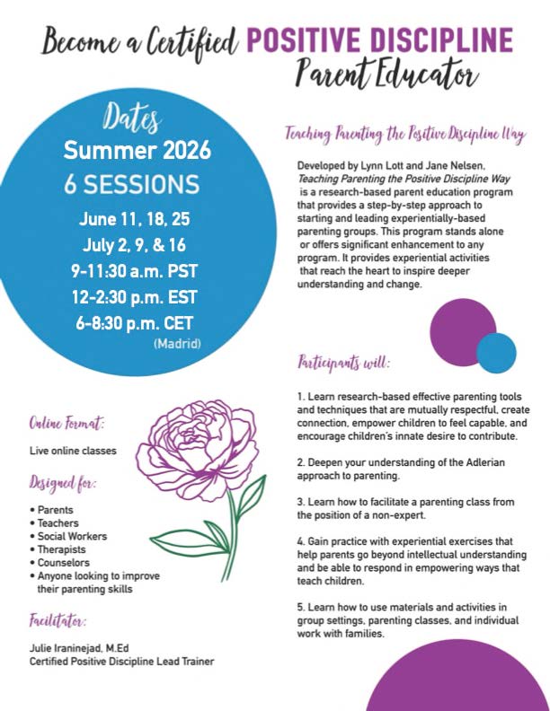 This is an online interactive workshop designed for parent educators, teachers, therapists, childcare professionals and others who want an effective discipline approach. This method is based on Adlerian Psychology and integrates social and emotional learning while reducing challenging behaviors. Successful participants will earn recognition as a Certified Positive Discipline Parent Educator and will: