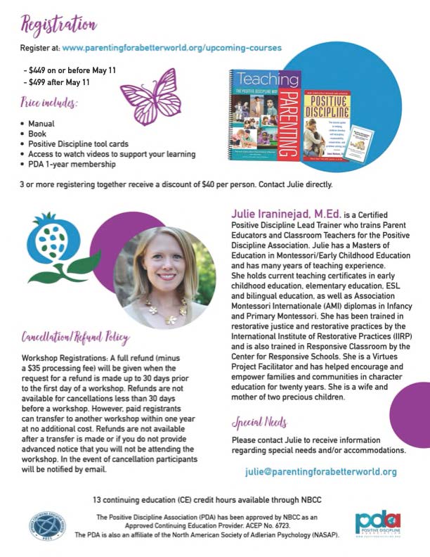 Price includes: manual, book, Positive Discipline tool cards, access to watch videos to support your learning, and PDA one year membership.